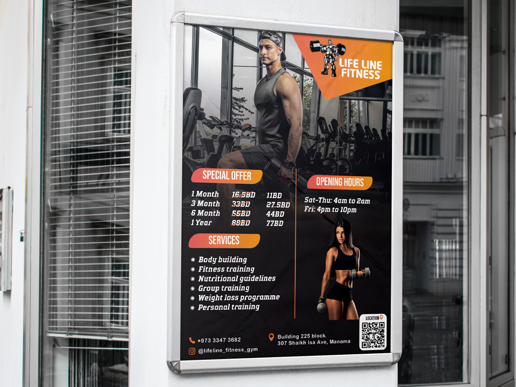 Introducing the dynamic poster design for Lifeline Gym, where vibrant orange meets bold black. This eye-catching fusion captures the essence of energy, power, and motivation.